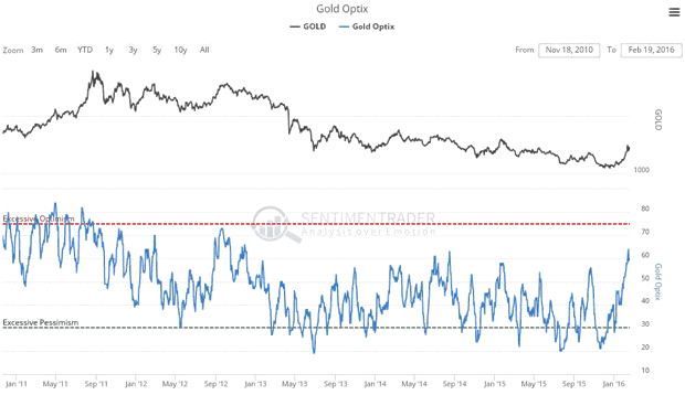 The latest gold Optix, or Optimism chart, shows that optimism towards gold has soared - to its highest levels since 2012. This has happened quickly and is another warning that a correction is probably imminent.