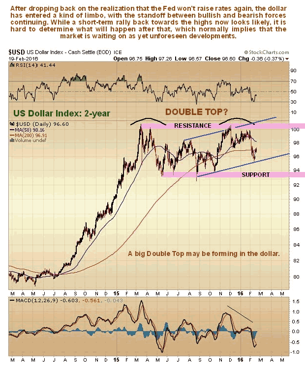 The 2-year chart for the dollar shows it trending sideways with a possible major top forming, with a temporary state of balance between bullish and bearish forces. On the bullish side we have the danger of a continued unwinding of the carry trade coupled with flight to safety into the dollar, on the bearish side the spreading realization that the Fed will join the pack and head in the direction of NIRP. A short-term rally towards the highs but not beyond them, in parallel with completion of the current stockmarket countertrend rally, will likely coincide with the expected correction in gold and silver.
