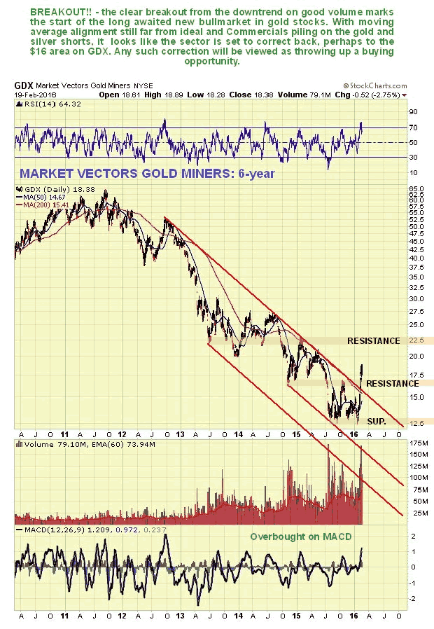 Precious Metals stocks have definitely broken out of their downtrend, as we can see on the 6-year chart for GDX shown below. However, this looks like a "too far too fast" situation, especially as moving average alignment is still unfavorable, so a correction back is in order here, that would accord with the prospects for gold and silver in light of their latest COTs.