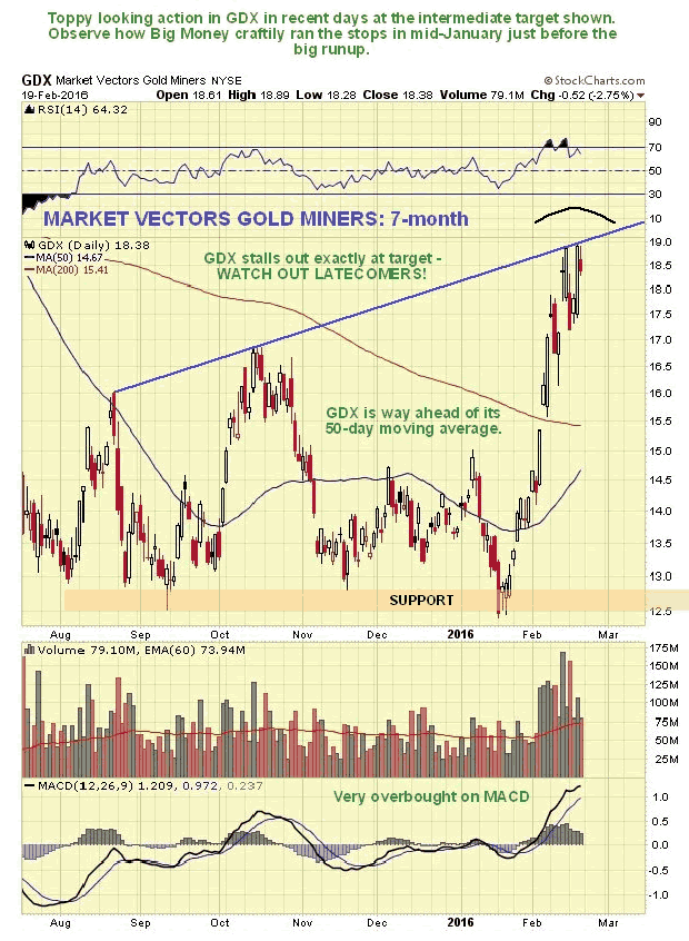 The 7-month chart for GDX is most interesting as it shows it rounding over having hit a target, so it is logical to expect it to correct back now. An amusing point to observe is how Big Money ran a lot of people out of their positions by triggering stops in mid-January - right before the big runup, a classic tactic.