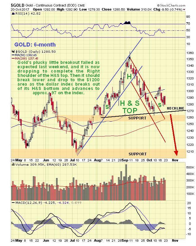 In last weekend’s update it was pointed out that gold’s gap breakout from its steep downtrend shown on its latest 6-month chart below was probably false and that it was expected to drop back as the dollar advanced, which it duly did last week. Bearing in mind that the dollar has about completed its Head-and-Shoulders bottom, it is now clear that a parallel Head-and-Shoulders top is completing in gold as shown on the chart. This chart projects a breakdown beneath the nearby support level to be followed by a drop targeting the quite strong support in the $1200 - $1215 area.