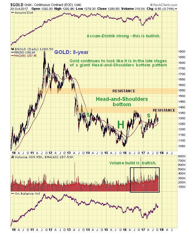 On gold’s 8-year chart it continues to look like it is in the late stages of a giant Head-and-Shoulders bottom pattern. The buildup in volume over the past 20 months certainly looks positive, especially over the past several months, all the more so because it has driven volume indicators higher, notably the Accum-Distrib line, which is not far off making new highs – exceeding its level at the 2011 peak. Once gold breaks above the resistance level approaching $1400 it will be on its way, although it will then have to contend with another important band of resistance in the $1510 - $1560 range. A near-term retreat by gold to the $1200 - $1215 area in the face of a dollar rally will not damage this long-term technical picture.