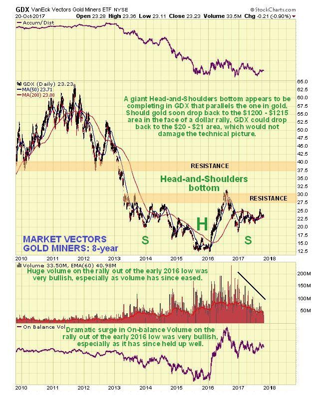 The Market Vectors Gold Miners, GDX, which functions as a gold stocks index, is marking out a giant Head-and-Shoulders bottom that roughly parallels the one completing in gold itself. A near-term decline to $20 - $21 in GDX will be viewed as presenting another important buying opportunity for the sector. The volume pattern during the build out of this base pattern is very bullish, with big volume on the rise out of the low (Head) of the pattern, tailing off steadily as the Right Shoulder has formed.
