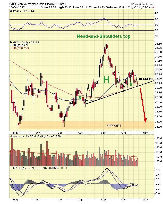 The latest 6-month chart for GDX shows an upsloping Head-and-Shoulders top completing which parallels the one completing in gold itself. This pattern targets strong support in the $20 - $21 area following the expected breakdown…