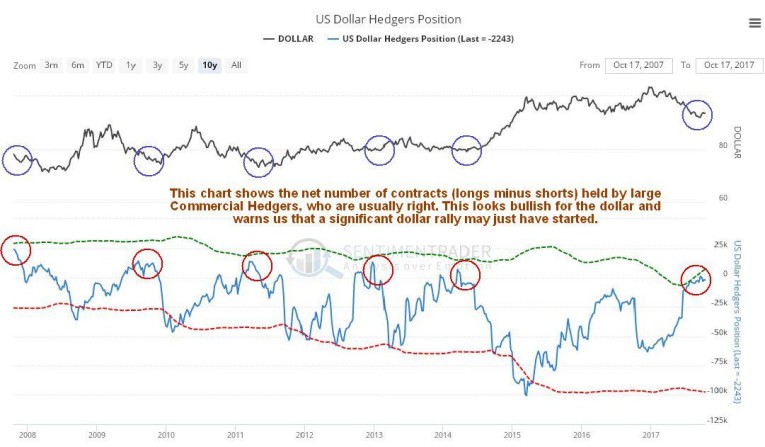 The Hedgers chart has been warning for weeks that the dollar will reverse and rally, as has been pointed out repeatedly. The latest chart shows that the rally is still ahead of us – which is congruent with the dollar having completed a valid Head-and-Shoulders bottom.