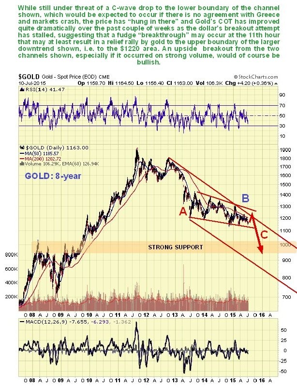 Let’s now proceed to look at the latest charts. The 8-year chart for gold shows it positioned for a C-wave plunge to the $850 - $1000 area, but its latest COT chart shown immediately below, reveals that Large Specs have almost given up on it, which in itself is bullish – these sort of readings have almost always marked important bottoms in the past. The COTs for both copper and silver now look positive too, in copper’s case after a quite steep drop. Here we should note too that the Chinese market has scope for further recovery after its recent brutal plunge, and the US stockmarkets are positioned to rally back to near their highs – if there is an easing of the Greek crisis.