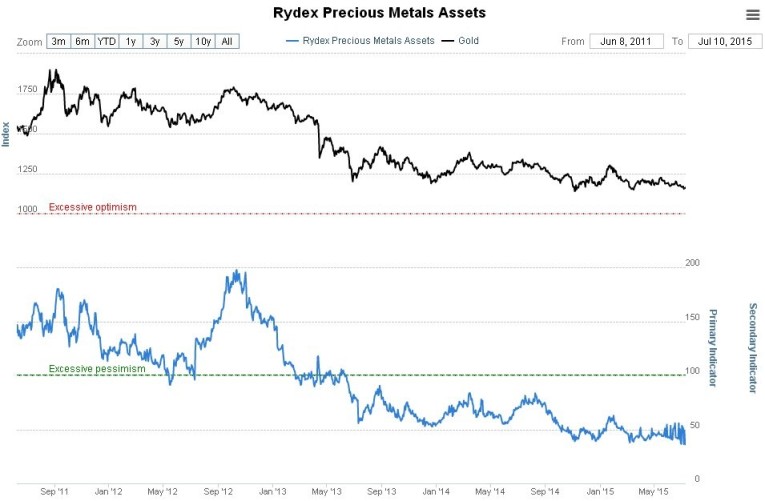 Rydex Precious Metals assets readings are now strongly bullish, since the dumb Rydex traders are always wrong and their holdings are now at a very low level. Their holdings peaked at the top of the bearmarket rally late in 2012. Interestingly, we have seen a pickup in volatility in this gauge in recent weeks, suggesting that some Rydex traders may be having second thoughts.