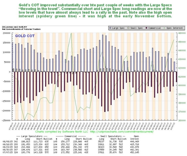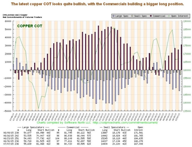 Conclusion: while it may look like this update is a classic example of fence sitting, there is a good reason for this, since the situation depends on the outcome of something which is unknowable, except to God – the outcome of the negotiations between the EU and Greece. What we can be sure about is that the scales will tip one way or the other very soon, and we do have some indication in the COTs, which are suggesting that after much protest the Greeks will kneel before their European masters and live on bread and water for years – in other words the recent vote will be ignored. However, if they walk away and out of the euro, a global selloff is likely to be the result involving a rising dollar and falling commodities, including gold and silver.
