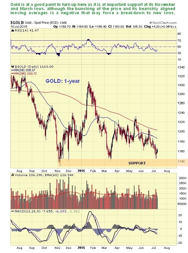The 1-year chart for gold shows that it is testing a zone of important support at its November and March lows, which is clearly a good point for it to turn up, although the positioning of the bearishly aligned moving averages close by above could force a breakdown to new lows.