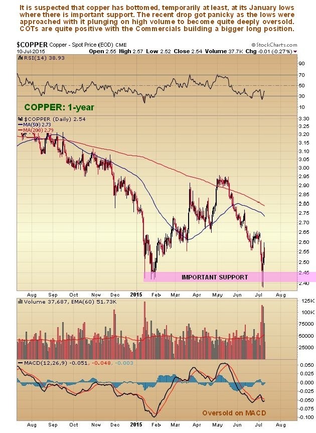 It’s worth digressing to look at the charts for copper, which provide circumstantial evidence of a possible intermediate bottom in commodities here. On copper’s 1-year chart we see that it too is in a good position to turn up, because after a steep drop from its May highs which got panicky early this month, it is oversold and at important support at its January lows. We shorted copper early in May.