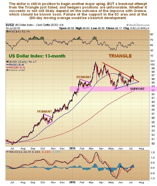 The biggest threat to commodity prices is the potential for another big upleg in the dollar, and what happens with the dollar depends on what happens to the euro (the dollar index has a 57% euro weighting), and what happens to the euro now depends now on the outcome of the Greek mess. In the last update we pointed out that the dollar was poised to begin another major upleg – it still is, BUT the breakout attempt is starting to look shaky and like it could fail. If it does fail and the support in the 93 area on the index fails, which just to be where the 200-day moving average is, which makes it more significant, then things could get ugly fast. This may be what the positive commodity COTs are signaling.