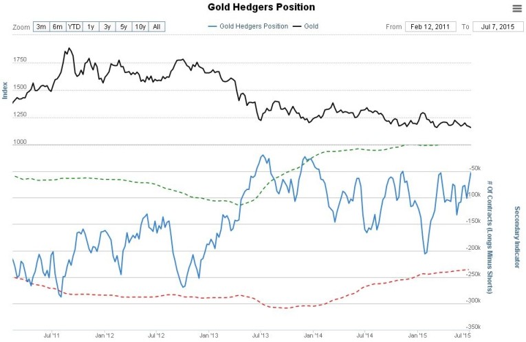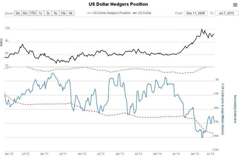 What about the dollar hedgers chart? – it is still showing quite strongly bearish readings, although they have eased from the extremes of a couple of months ago. So the dollar could be topping out after all. The big dollar rally of the past year has been driven by a combination of the euro’s woes and unwinding of the global carry trade ahead of an expected Fed rate rise. While it is hard to see the euro improving much, since a fudge solution of the Greek mess will only buy time for the beleaguered single currency, the carry trade unwind could stall out if the market senses that the Fed is bluffing re raising rates, because it can’t due to its back being to the wall. This would probably be the reason for a drop in the dollar.