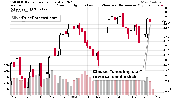 At least not without a serious signal and its confirmation. Preferably from many related markets. On Monday (Jul. 24), I wrote about the critical nature of the reversals that we saw across the board in weekly terms, and yesterday, I added a special note about the situation in the stock market. Namely, I wrote that since the 2022 decline started with a very brief move above the previous intraday high of the weekly reversal, it’s not a game-changer to see something like that this time.