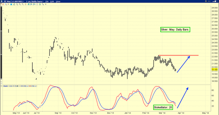 That’s the daily silver chart. Note the stokeillator, at the bottom of the chart. The lead line is at about 20, which is where decent minor trend rallies can begin.