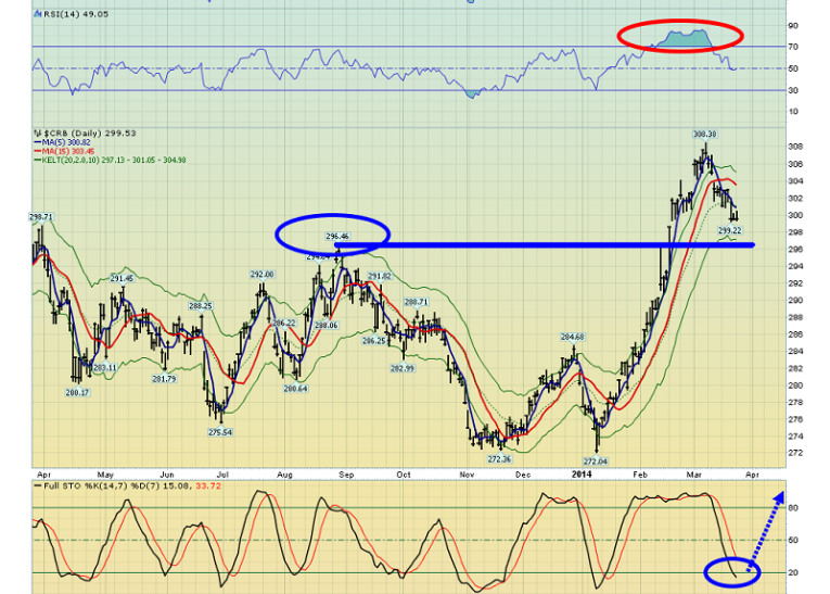 Generally speaking, most technical indicators are oversold on commodity index monthly charts, but a little overbought on the weekly charts. They are generally “almost oversold” on the daily charts.