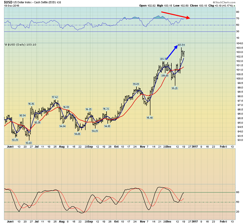 Note the RSI non-confirmation with the price on that daily bars US dollar index chart. The dollar’s technical strength is weakening quite dramatically.