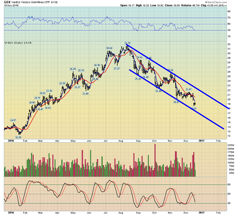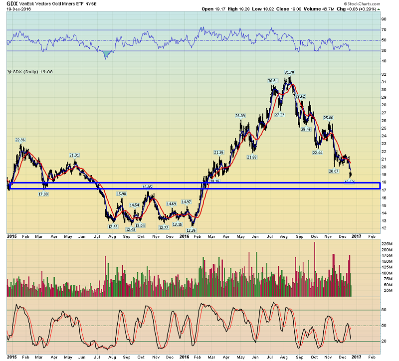 That’s a third view of the GDX daily chart. There is support in the $17 - $18 area, and an important buying area. Importantly, this chart shows that there was no uptrend in place in the days following last year’s rate hike. GDX declined to a final low in January of 2016, but it wasn’t until the spring that an uptrend was apparent. The bottom line: