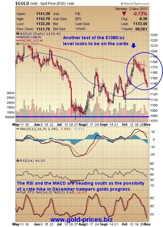 The “will they won’t they” hike rates in the US casts a shadow over gold prices and hampers gold’s ability to gain any traction. The recent FOMC meeting has hinted once again that a rate hike is possible in December…and so the prospect of a stronger US Dollar puts downward pressure on gold in dollar terms.