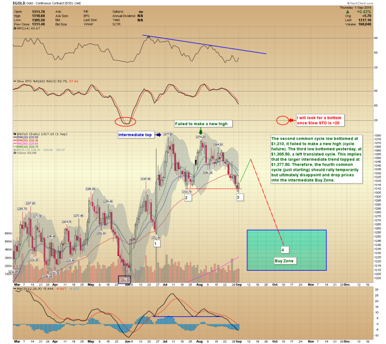 The second common cycle low bottomed at $1,310; it failed to make a new high (cycle failure). The third low bottomed yesterday, at $1,305.50, a left translated cycle. This implies that the larger intermediate trend topped at $1,377.50. Therefore, the fourth common cycle (just starting) should rally temporarily but ultimately disappoint and drop prices into the intermediate Buy Zone.