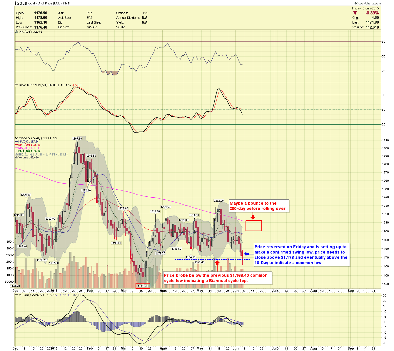 The gold price managed a decent reversal on Friday and has set itself up to make a confirmed swing low. If prices bounces higher from here I don’t see it making it past the 200-day average and that bounce should exhaust on or before the Fed meeting June 16/17.