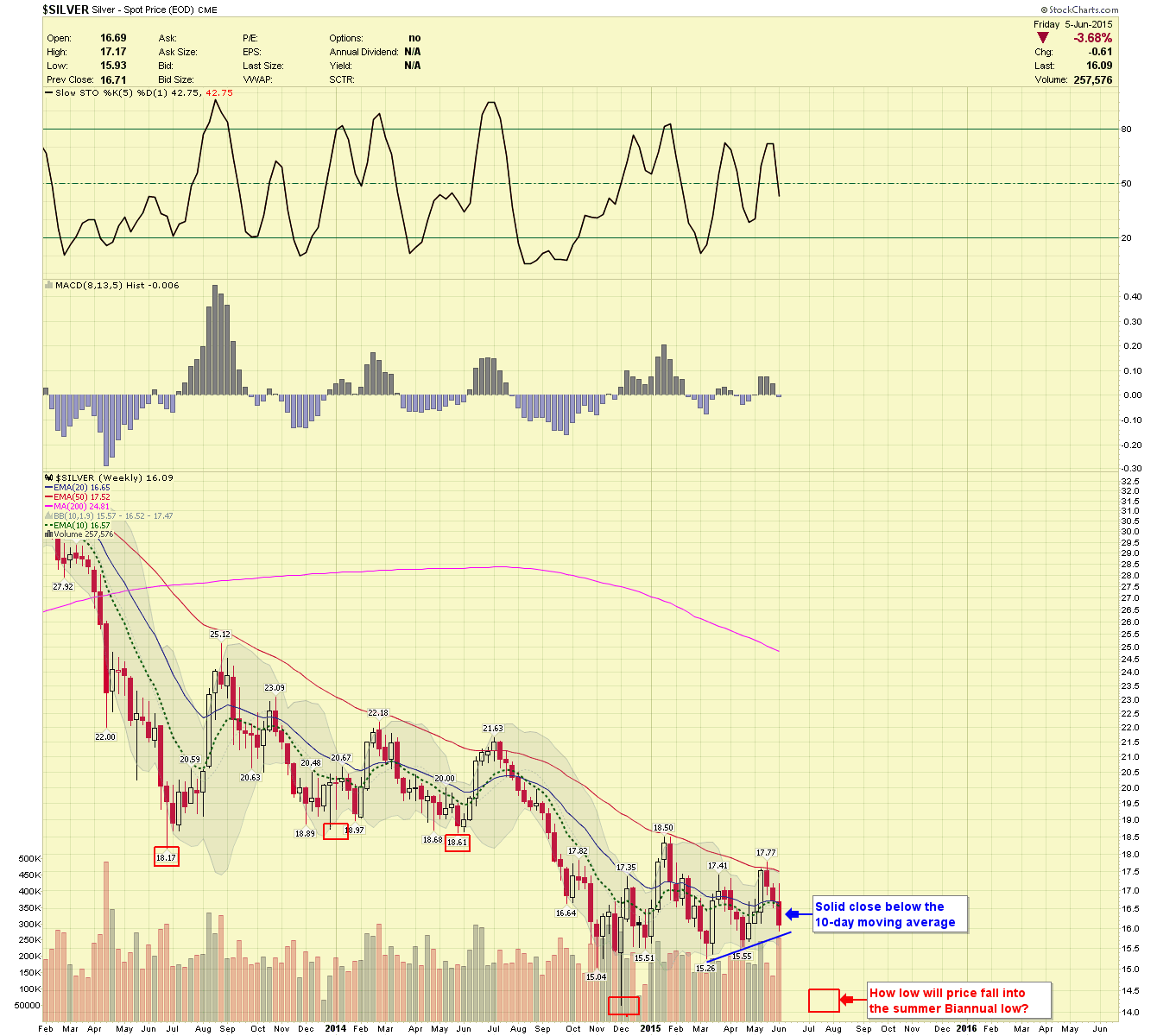 Silver prices closed below the 10-week moving average indicating that $17.77 is indeed the Biannual cycle high. As with gold, the question now is how low the price will drop before bottoming later this summer.