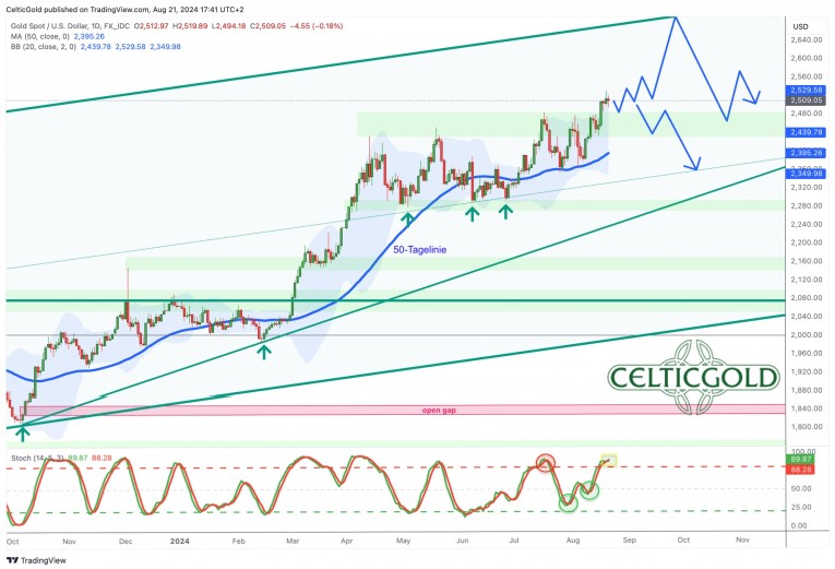 The breakout above the upper Bollinger Band (USD 2,498) on the weekly chart suggests more or less immediate new upward potential. In any case, the bulls are pushing this strong resistance upwards, so gold prices could indeed continue to rise in the coming weeks. As well, the stochastic oscillator supports this thesis with an active buy signal. The oscillator still has room before reaching the overbought zone.