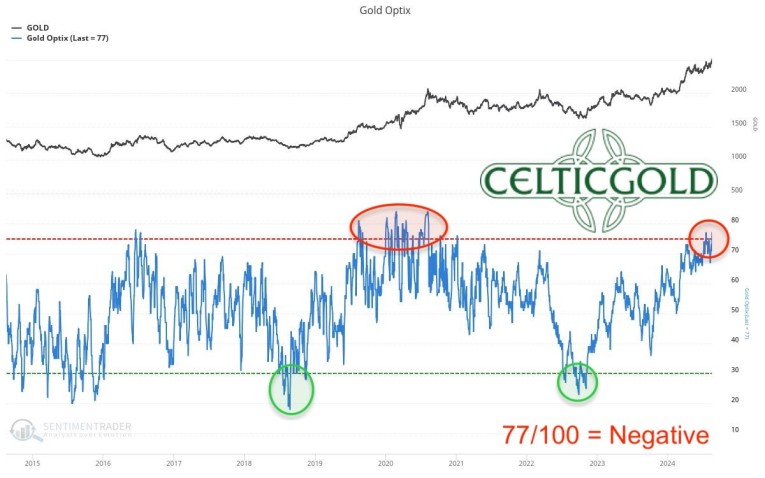 Sentiment Optix for gold as of August 19th, 2024. Source: Sentimentrader