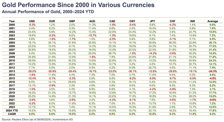 Gold performance since 2000 in various currencies, as of August 10th, 2024. Source: Incrementum AG