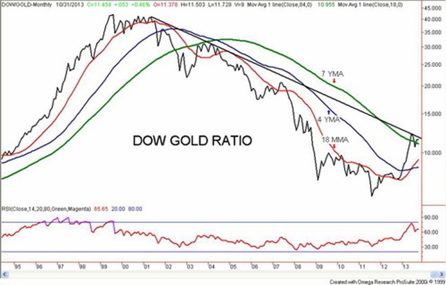 Gold has underperformed both stocks and bonds since September 2011. Both the Gold/Bonds ratio and the DJI/Gold ratio have run into long-term resistance of the 7 year MA. In both instances, the 18-month MA has crossed or is at least attempting to cross over the 4 year MA. Both the 18-month MA and the 4-year MA remain below the 7-year MA. A breakout over that level would signal that the long terms trends have shifted firmly away from gold to stocks and bonds. Until that happens, history and a potential failure at major resistance suggests that the long-term trend should shift back in favour of gold once again.