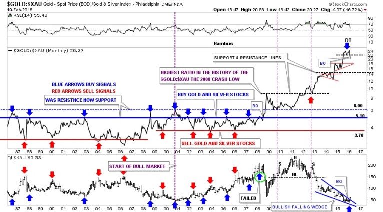 During the bull market years I would add a blue arrow when the ratio chart would rally up to the 5.10 area where I would be looking for a reversal to the upside on the $XAU. As you can see I haven't added any blue arrows since the one that failed in 2008 which led to the crash, blue arrow with the green circle around it. That failure in 2008 on the ratio chart, when it broke above all the previous highs blue dashed horizontal line, was a history making event for the PM stocks. As you can see I've added a blue arrow at the double top high for the ratio chart and a blue arrow at the the recent low on the $XAU chart at the bottom.
