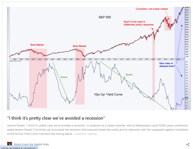 A majority of hopeful people and the media tending them continue to tout the wrong-headed idea that since the curves de-inverted, we have avoided a recession. Why, on December 18th Fed chief Powell actually said so after the FOMC meeting previous to this week’s, calling into question his competence (or his forthrightness).