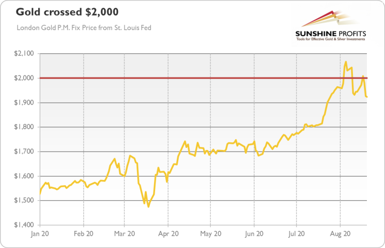 $2,000. Think about this number. Theoretically, it’s just a number, one of many. But… somehow we feel that jumping above this level was a big event in the gold market. After all, gold surpassed this psychologically important point for the first time in history, reaching record high, as the chart below shows.