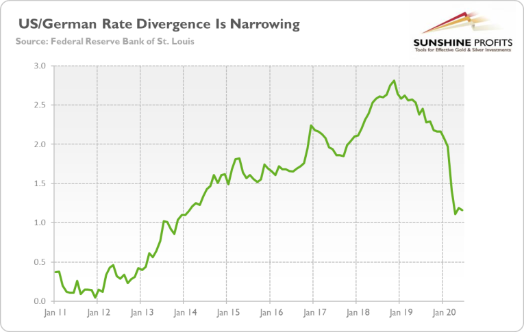 First, the dollar tends to weaken during risk-on episodes, so when market sentiment improved after the worst phase of the coronavirus crisis, the greenback simply corrected after previous gains. Second, the U.S. central bank eased its monetary stance in the response to the economic collapse, slashing interest rates. The lower yields and interest rates accrued to the dollar-denominated bonds narrowed the divergence in interest rates across the Atlantic (see the chart below), which reduced capital inflows into America and triggered a shift in holdings in favor of other markets.
