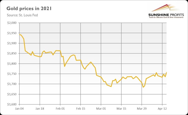 Finally! The price of gold has been rising recently. As the chart below shows, the yellow metal rebounded from the late March bottom of $1,684 to above $1,770 on Friday (Mar. 16). This could be a promising start to the second quarter of 2021, which looks better than the first.