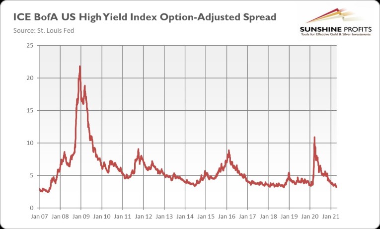 Please take a look at the chart below which shows the level of credit spreads – as you can see, they have fallen to very low levels, which implies that they won’t get much lower than they are right now. So, it appears that the next big move will rather be a rise in credit spreads or a decline in economic confidence.