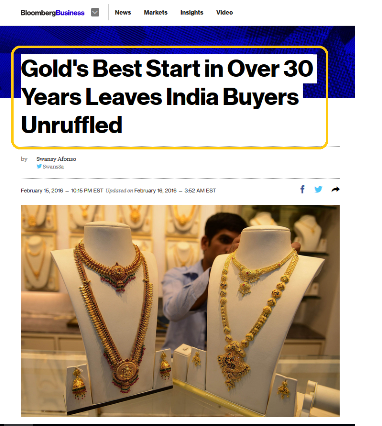 I don’t think Bloomberg has all the facts about what is happening in India. There is a lull in buying, but the gold price rally is only part of the reason for that lull. In the bigger picture, the national budget is scheduled for release within about two weeks. Most jewellers expect the gold import duty to be cut from 10% to the 2% - 4% range.