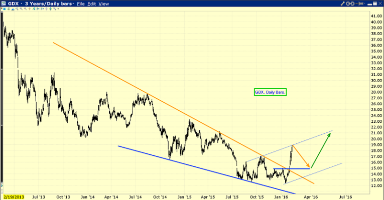 This is the phenomenal GDX daily bars chart. I suggested that GDX would stage a violent upside rally from the wedge pattern, and that has happened.