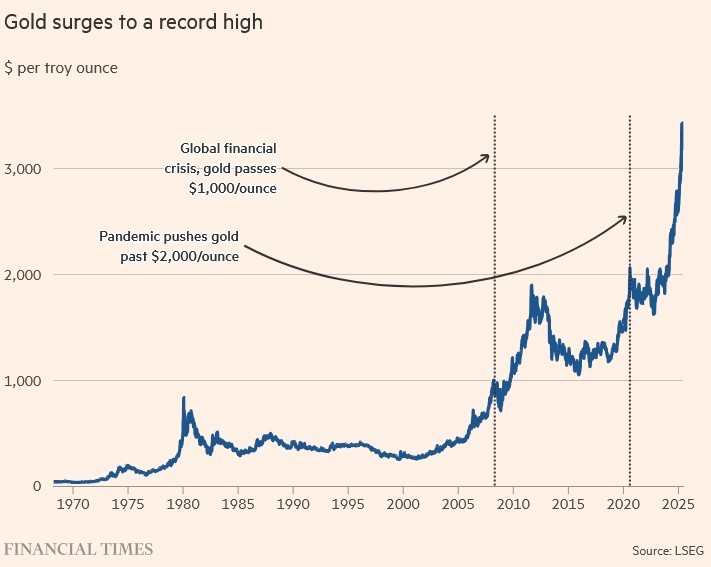 Consequently to stop a run on the dollar on August 15, 1971, President Nixon closed the gold window, defaulting and established a fiat currency (backed only by the good faith of the United States) in order to halt the panic. The gold price went from $35 to $800 an ounce in 1980 or 2,300 percent and as the free price of gold soared, the US dollar devalued further against the price of gold, losing its purchasing power. Since then, gold has topped $1,000 during the financial crisis of 2008-2009, $2,000 during the Covid pandemic, followed by a new peak at $3,000 on Mr. Trump’s Liberation Day. Risk? Gold is simply a barometer of investor anxiety. In all cases gold was a store of value. The currency of choice is trust. We believe that in a de-dollarized world, America’s dysfunctional finances and weaponization of the dollar will power gold even higher. The best lies ahead.