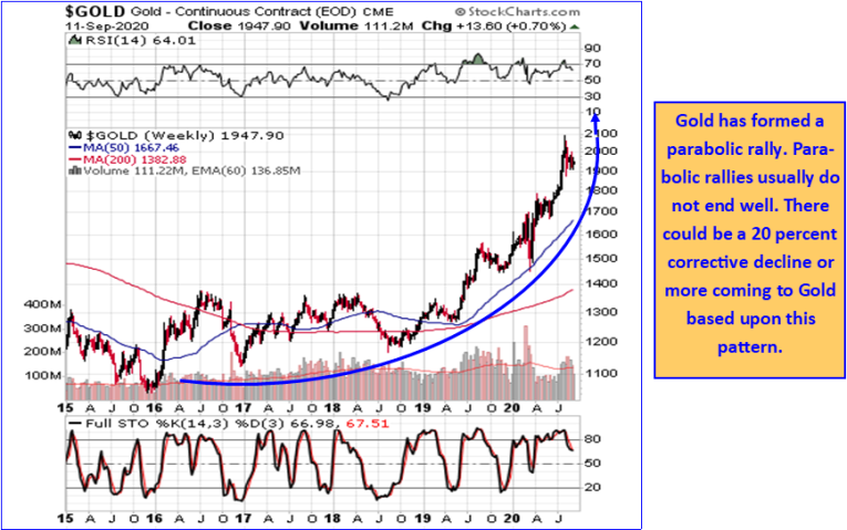 Gold is inside a long-term Bull market. In a previous article published at the Gold-Eagle site back in September 2020, we pointed out that gold had formed a Parabolic rise that would lead to a corrective decline, one that would be significant. We showed the below chart and wrote, “The problem for gold bugs is that Parabolic rallies usually do not end well.”