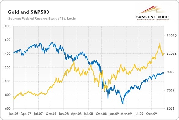 Chart 1: Gold prices (yellow line, right scale) and S&P500 Index (blue line, left scale) from 2007 to 2009