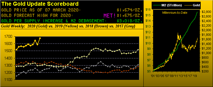 There's something about the Gold price of 1691. Oh to be sure, 'tis 16 points above our forecast high for this year of 1675, a level which according to the "Coronavirus? Who Knew? Dept." may in hindsight appear -- as we suggested back on 04 January before anyone knew of said virus -- conservative. Then, Gold was "just" 1555, after having been as low as 1268 in "just" in May of last year. A pretty darn good run, that. And yet most broadly, the above Scoreboard's present "debasement" value of 3018 ought one day be seen.