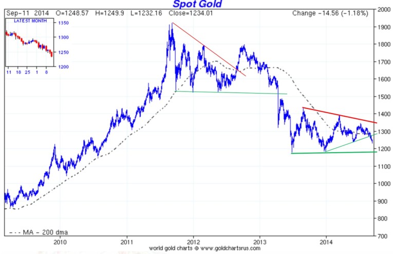 After the original drop in gold price from the top of $1,920 per ounce in 2011 to $1,180 per ounce in 2013, gold has started a sideways consolidation triangle pattern. Is this a correction, or is it just a pause within a move that will retrace the whole move since 2009? What does sentiment tell us?