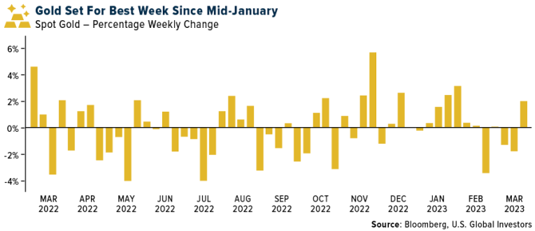 - Gold is poised for its best week since mid-January, reports Bloomberg, as the dollar weakens on signs that China’s economic recovery is gathering pace. Bullion climbed higher Friday as a gauge of the dollar extended what would be its first weekly decline in five, making the precious metal cheaper for most buyers. China’s economy is rebounding rapidly, the article explains, while Euro-area inflation is proving hotter than expected, raising the prospect of more tightening from the bloc’s central bank.