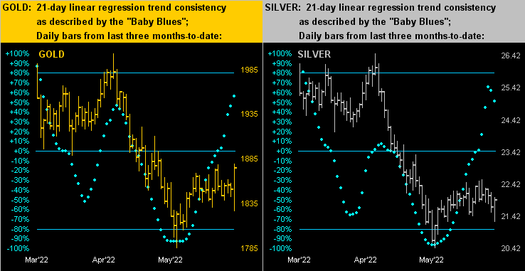 Specific to the precious metals, next we've their daily bars from three months ago-to-date for Gold on the left and for Silver on the right. Fairly identical looking panels, although Silver's "Baby Blues" of trend consistency have just taken an abrupt twist, the Gold/Silver ratio noted earlier as 85.5x which is well above its millennium-to-date mean of 66.8x. 'Tis key to bear in mind that Gold 1875 is at 90% of its All-Time High, whereas for 21.93 Silver today, she's priced at just 44% of her record high. Don't forget the Silver: