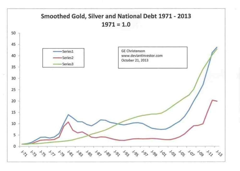 Examine the following graph. It is a graph of smoothed* annual gold and silver prices and the official U.S. national debt since 1971 when the dollar lost all gold backing and was “temporarily” allowed to float against all other unbacked debt based currencies. All values start at 1.0 in 1971.