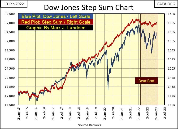 On the Dow Jones side of the table, note its step sum is unchanged since December 14th, to this week’s close; 1604. Yet the Dow Jones itself is down 1.74% since December 14th. This is the stuff of a bear box in progress, and that isn’t good for the bulls.