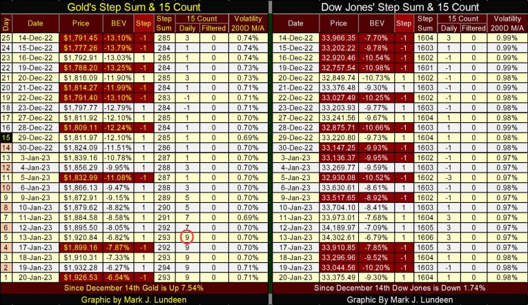In gold’s step sum table below, gold remains very overbought with a 15-count of +9 for the past five trading days. Markets don’t like being very overbought, so we should expect some down days in the week ahead of us. Still, with gold’s bear box above now behind us, who can say what is going to happen in the gold market? I just like seeing gold’s step sum rising with the price of gold.