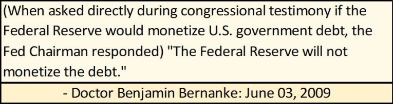 Six months into his QE-1, Doctor Bernanke, under oath before Congress, was asked if the Fed was going to “monetize the national debt.” His reply was comical; that “the Federal Reserve will not monetize the debt.” Anyone who followed the statistics published weekly by the FOMC knew it was a lie, and a BIG one at that.