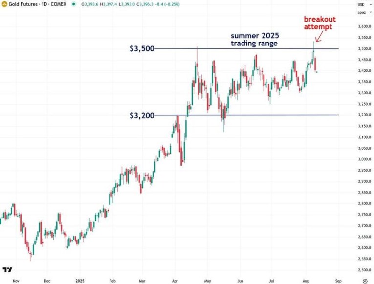 The chart below of COMEX gold futures shows this summer’s trading range and Thursday night’s attempt to break above the $3,500 resistance level following speculation that gold bullion might be tariffed. However, there was no close above that level, so the breakout was not confirmed.