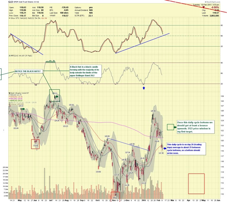 GLD DAILY - We are on day 26 (trading days) from the previous daily cycle low, they average 25 days, so we should be close to a bottom.